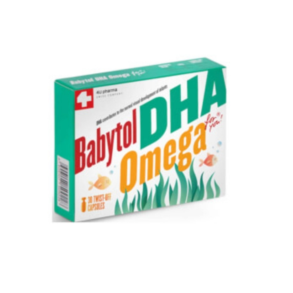 Babytol DHA Omega je dodatak prehrani za djecu koji u jednoj twist-off kapsuli osigurava 100 mg DHA omega-3 masnih kiselina iz ulja morskih mikroalgi, neophodnih za pravilan razvoj mozga i vida.