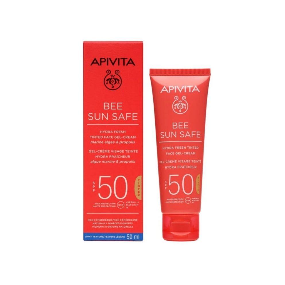 Apivita Bee Sun Safe Hydra Fresh gel-krema za lice tonirana SPF 50 50 ml pruža vrlo visoku zaštitu od UVA i UVB zraka, dok ujednačava ten i hidrira kožu. Obogaćena patentiranim ekstraktom propolisa, morskim algama i hijaluronskom kiselinom, brzo se upija, ostavljajući kožu svježom, glatkom i blistavom, bez masnog sjaja.