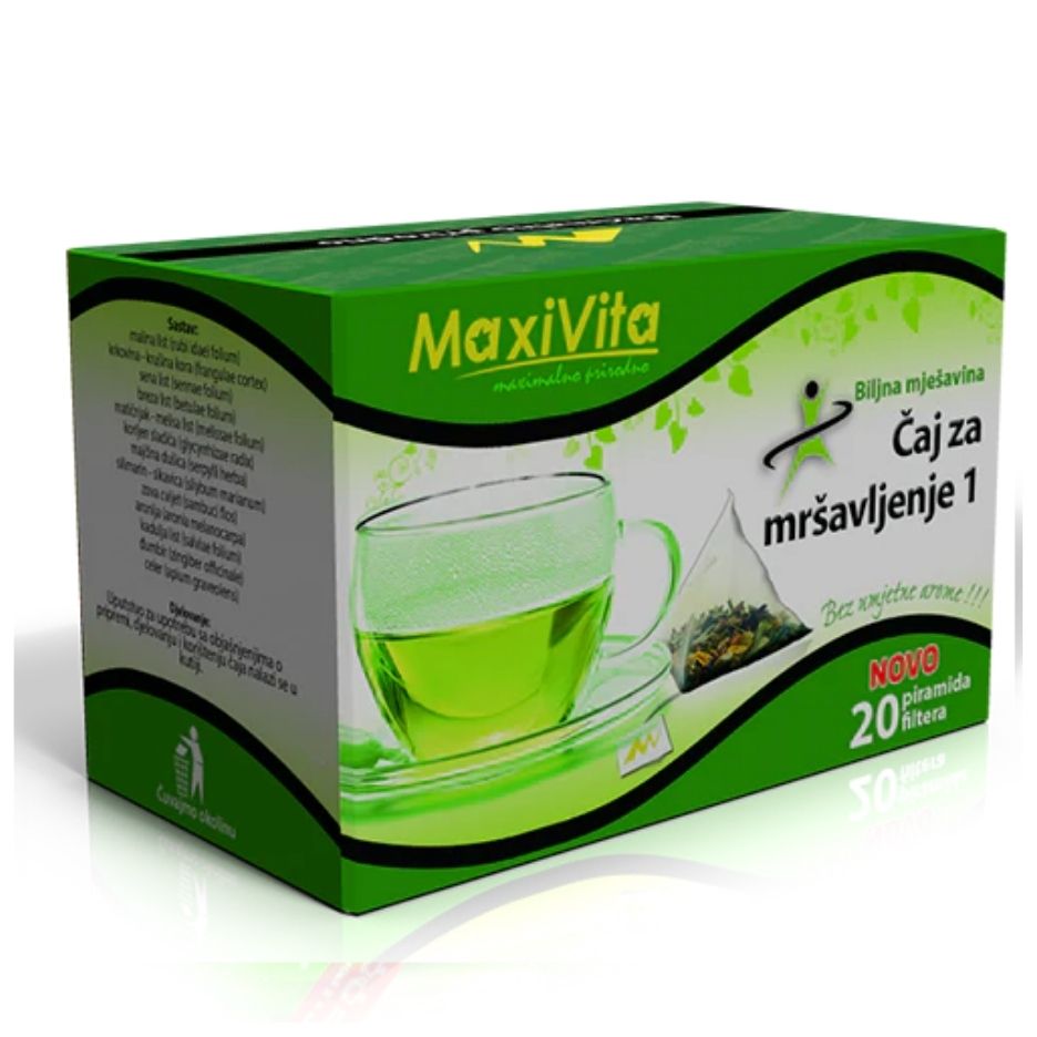 Maxivita Čaj za mršavljenje 1 20 filter vrećica je biljna mješavina listova i trava koja potiče ubrzanje metabolizma, podržava izbacivanje viška vode i pomaže regulirati apetit za podršku mršavljenju.