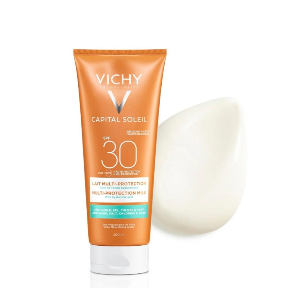 Vichy Capital Soleil hidratantno mlijeko za osjetljivu kožu SPF30 300 ml pruža srednju zaštitu od UVA i UVB zraka, uz istovremenu hidrataciju i umirenje osjetljive kože. Lagana, nemasna formula brzo se upija i ne ostavlja bijele tragove, čineći je idealnom za svakodnevnu upotrebu. Obogaćeno Vichy vulkanskom vodom i hijaluronskom kiselinom, jača kožnu barijeru i pomaže u očuvanju elastičnosti i mekoće kože.