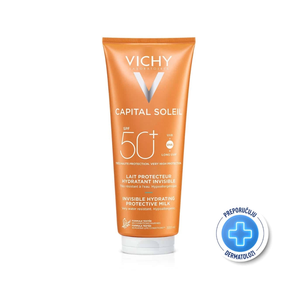 Vichy Capital Soleil hidratantno mlijeko za osjetljivu kožu SPF50+ 300 ml pruža visoku zaštitu od UVA i UVB zraka, uz intenzivnu hidrataciju i umirenje osjetljive kože. Lagana i nemasna formula brzo se upija, ne ostavlja bijele tragove i pogodna je za svakodnevnu upotrebu. Obogaćeno Vichy vulkanskom vodom i hijaluronskom kiselinom, jača kožnu barijeru, štiti od oštećenja uzrokovanih suncem i pomaže u očuvanju mekoće i elastičnosti kože.