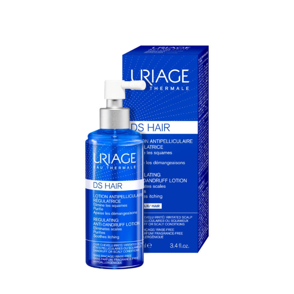 Uriage D.S. losion u spreju je tretmanski proizvod namijenjen vlasištu i koži sklonoj ljuspanju, crvenilu i seboreji. Smanjuje perut, umiruje iritacije i reguliše mikrobnu ravnotežu zahvaljujući kombinaciji Uriage termalne vode i specijalizovanih aktivnih sastojaka. Pogodan je za upotrebu na suvoj ili vlažnoj kosi, bez ispiranja.