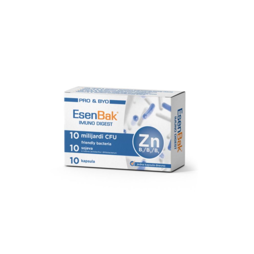 EsenBak IMUNO DIGEST predstavlja kombinaciju 10 pažljivo odabranih probiotskih kultura, cinka, vitamina B grupe i aminokiseline L-lizina za snažan imunitet i bolje varenje.