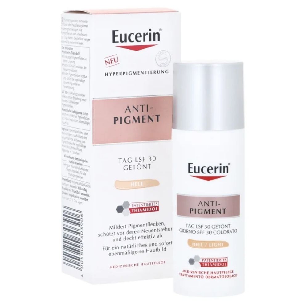Eucerin Anti-Pigment dnevna tonirana njega SPF 30 – light 50 ml je tonirana dnevna krema koja smanjuje tamne mrlje i sprječava njihovo ponovno pojavljivanje. Obogaćena thiamidolom i pigmentima svijetlog tona, pruža ujednačen ten i prirodan izgled kože. SPF 30 i UVA zaštita štite kožu od sunca i preranog starenja.