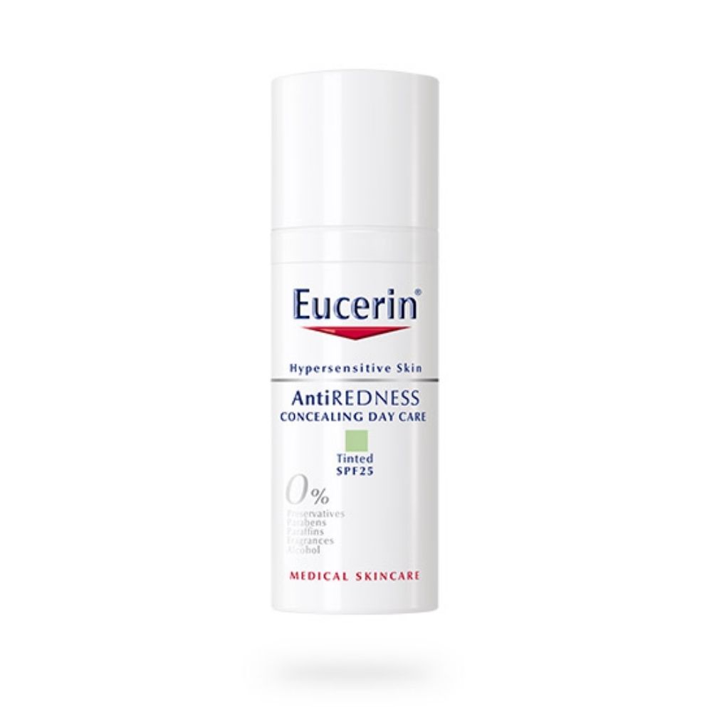 Eucerin AntiREDNESS dnevna krema protiv crvenila sa zelenim pigmentom SPF 25 50 ml je krema koja trenutno smanjuje crvenilo i umiruje osjetljivu kožu. Obogaćena SymSitive-om za jačanje tolerancije kože i zelenim pigmentima koji neutraliziraju crvenilo. SPF 25 pruža zaštitu od UV zraka i sprječava dodatne iritacije.