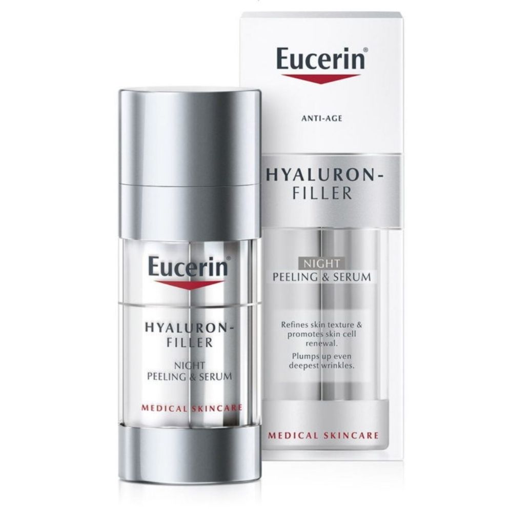 Eucerin Hyaluron-Filler noćni piling & serum 30 ml je kombinacija seruma i pilinga koja smanjuje vidljivost bora i poboljšava teksturu kože. Sadrži hijaluronsku kiselinu i AHA kiseline koje uklanjaju mrtve ćelije kože, čineći kožu glatkom, svježom i hidratiziranom tokom noći. Ovaj tretman također potiče obnovu kože, ostavljajući je mekšom i mladalačkijeg izgleda.