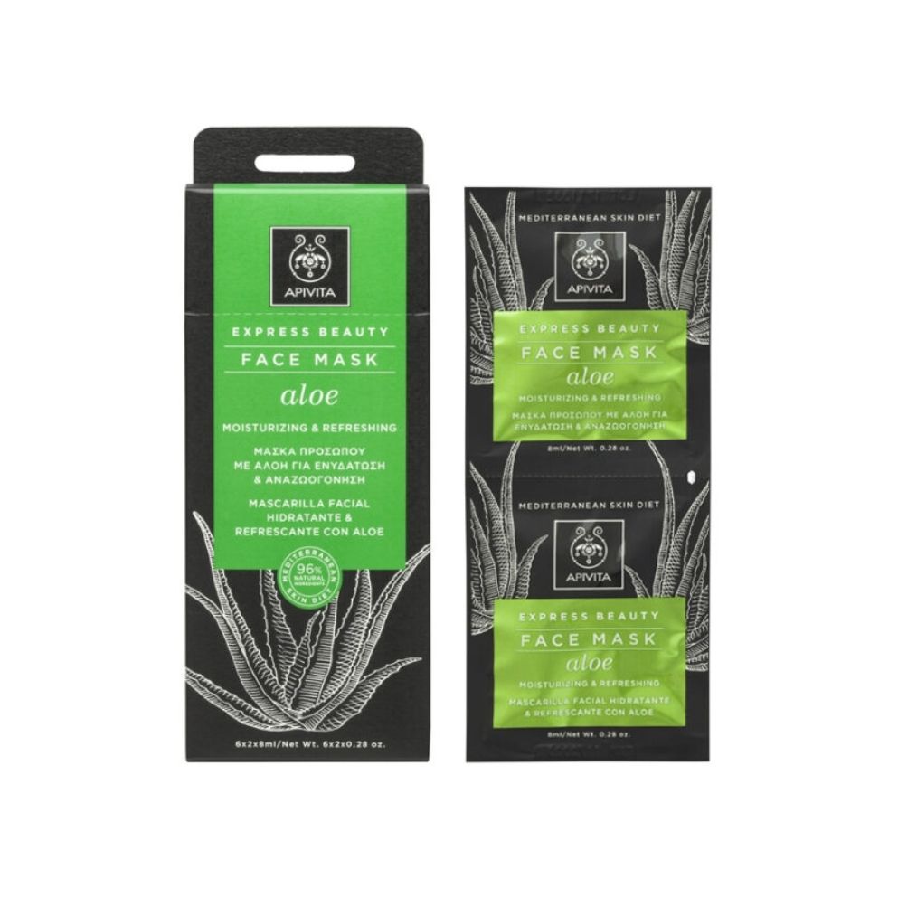 Apivita Express Beauty maska za lice s aloe verom – hidratacija i umirenje kože 2×8 ml pruža intenzivnu hidrataciju i trenutno umiruje kožu. Obogaćena aloe verom, hijaluronskom kiselinom i ekstraktom kamilice, obnavlja vlagu, smanjuje iritacije i ostavlja kožu mekom, glatkom i osvježenom.