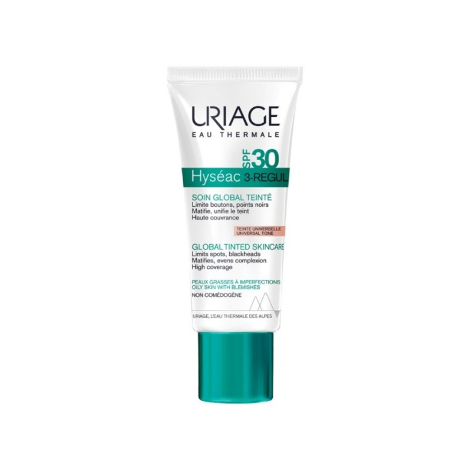 Uriage Hyséac 3-Regul tonirana krema SPF 30 kombinuje njegu za masnu i aknama sklonu kožu sa zaštitom od sunca i ujednačavanjem tena.