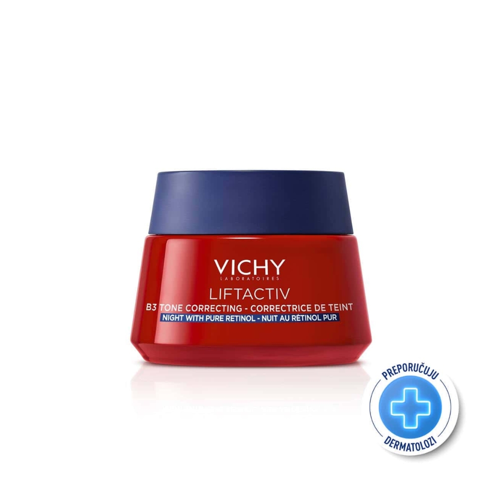 Vichy Liftactiv B3 + Retinol noćna krema protiv tamnih mrlja 50 ml intenzivna je noćna njega koja djeluje na smanjenje postojećih hiperpigmentacija i sprječavanje pojave novih. Kombinacija niacinamida (vitamin B3) i čistog retinola pomaže u obnavljanju površine kože, ujednačavanju tena i smanjenju vidljivosti bora. Obogaćena Vichy vulkanskom vodom, jača kožnu barijeru i pruža hidrataciju tokom noći, ostavljajući kožu glatkom, blistavom i obnovljenom.