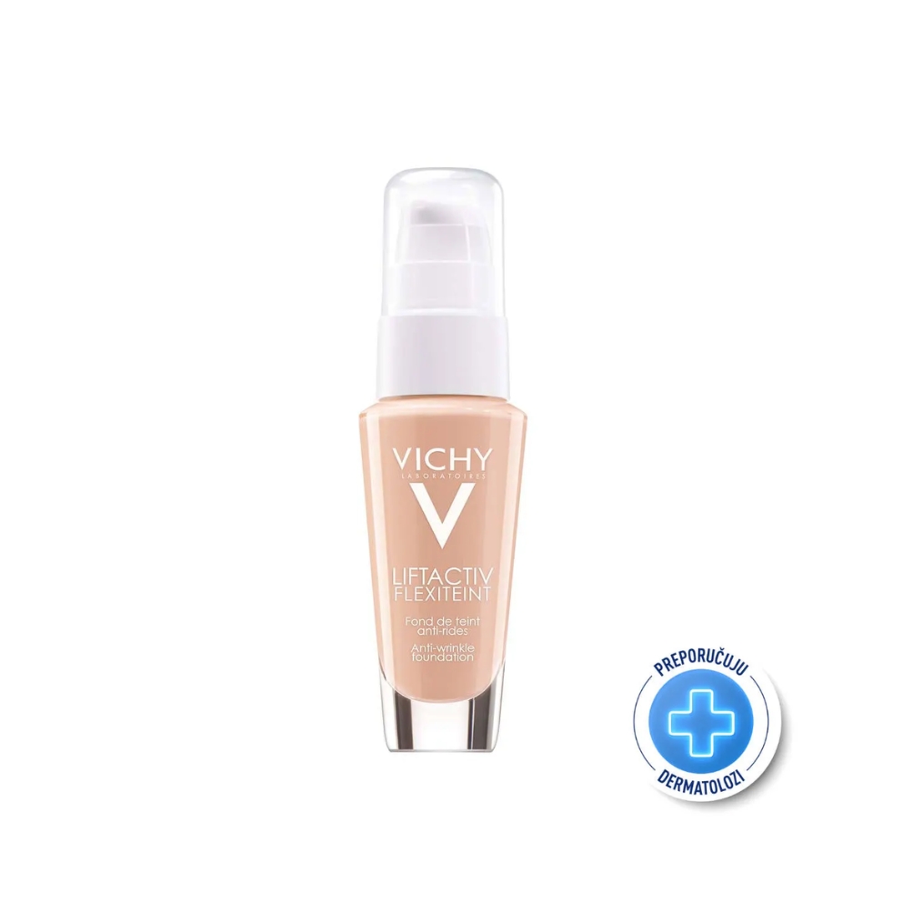 Vichy Liftactiv Flexiteint 25 Nude puder 30 ml je tečni puder koji ujednačava ten, zaglađuje bore i pruža prirodan, blistav izgled kože tokom cijelog dana. Lagana, hidratantna formula omogućava ugodno nošenje, a obogaćena je Vichy vulkanskom vodom i aktivnim sastojcima protiv starenja koji pomažu u održavanju elastičnosti kože i smanjenju vidljivosti finih linija.