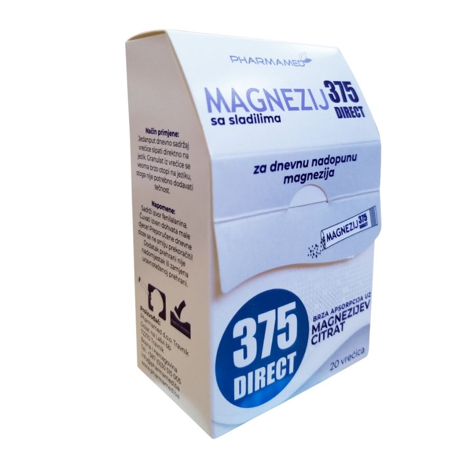 Magnezij 375 mg Direct a30 je dijetetski dodatak prehrani u pakiranju od 30 tableta za brzo otapanje u ustima, namijenjen podršci normalnoj funkciji mišića i živčanog sustava te smanjenju umora.