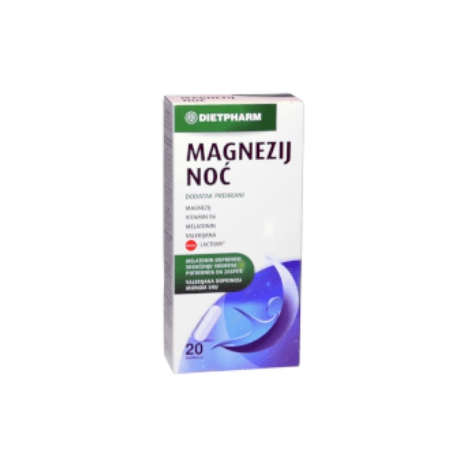 Dietpharm Magnezij Noć kapsule su dodatak prehrani namijenjen osobama s poteškoćama usnivanja, isprekidanim snom ili jet-lagom. Kombinacija magnezija, vitamina B6, melatonina, valerijane i Lactium®-a doprinosi opuštanju, skraćenju vremena potrebnog za san i mirnijem snu.