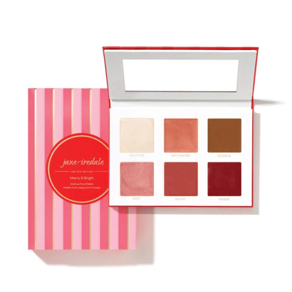 Jane Irediale Merry & Bright Multiuse Face Palette je paleta s nijansama rumenila, bronzera i highlightera za svečani i višedimenzionalni sjaj lica.