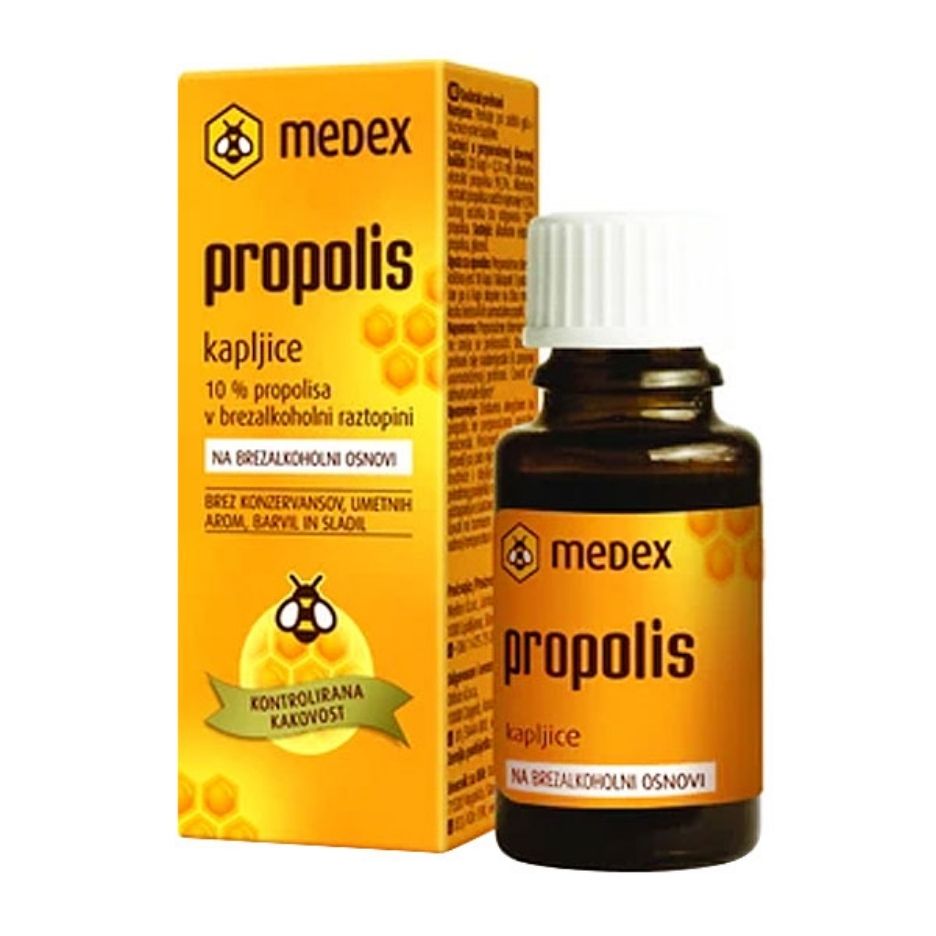 Medex Propolis kapi bez alkohola 30 ml je biljna tinktura s izvornim propolisom u glicerin-vodenoj otopini koja blago i učinkovito podržava imunitet, umiruje sluznice grla i dišnih putova te doprinosi zaštiti organizma.