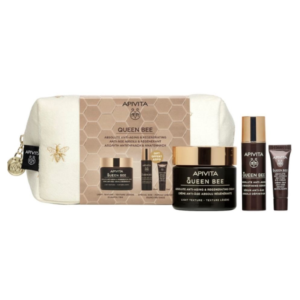 Apivita Set Queen Bee Absolute Anti-Aging & Regenerating uključuje tri proizvoda koja pružaju potpunu njegu protiv starenja, regeneraciju i revitalizaciju kože: