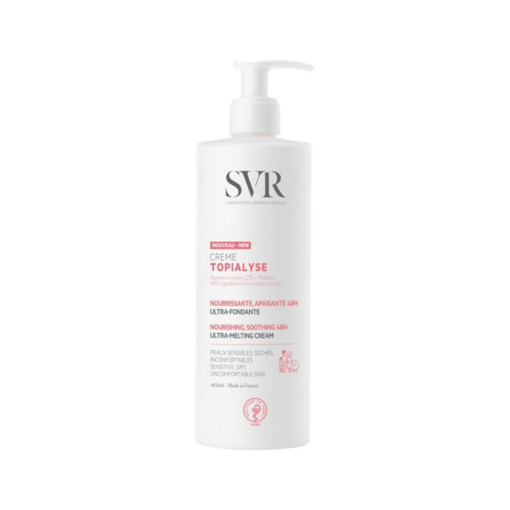 SVR TOPIALYSE krema za njegu suhe i osjetljive kože 400 ml je intenzivna hidratantna krema koja pruža dugotrajnu zaštitu i njegu za suhu, osjetljivu i iritacijama skloni kožu. Obogaćena umirujućim i hranjivim sastojcima, ova krema obnavlja kožnu barijeru, smanjuje crvenilo i nelagodu, te vraća koži mekoću i glatkoću. Idealna je za svakodnevnu njegu kože skloni atopijskom dermatitisu ili suhoći.