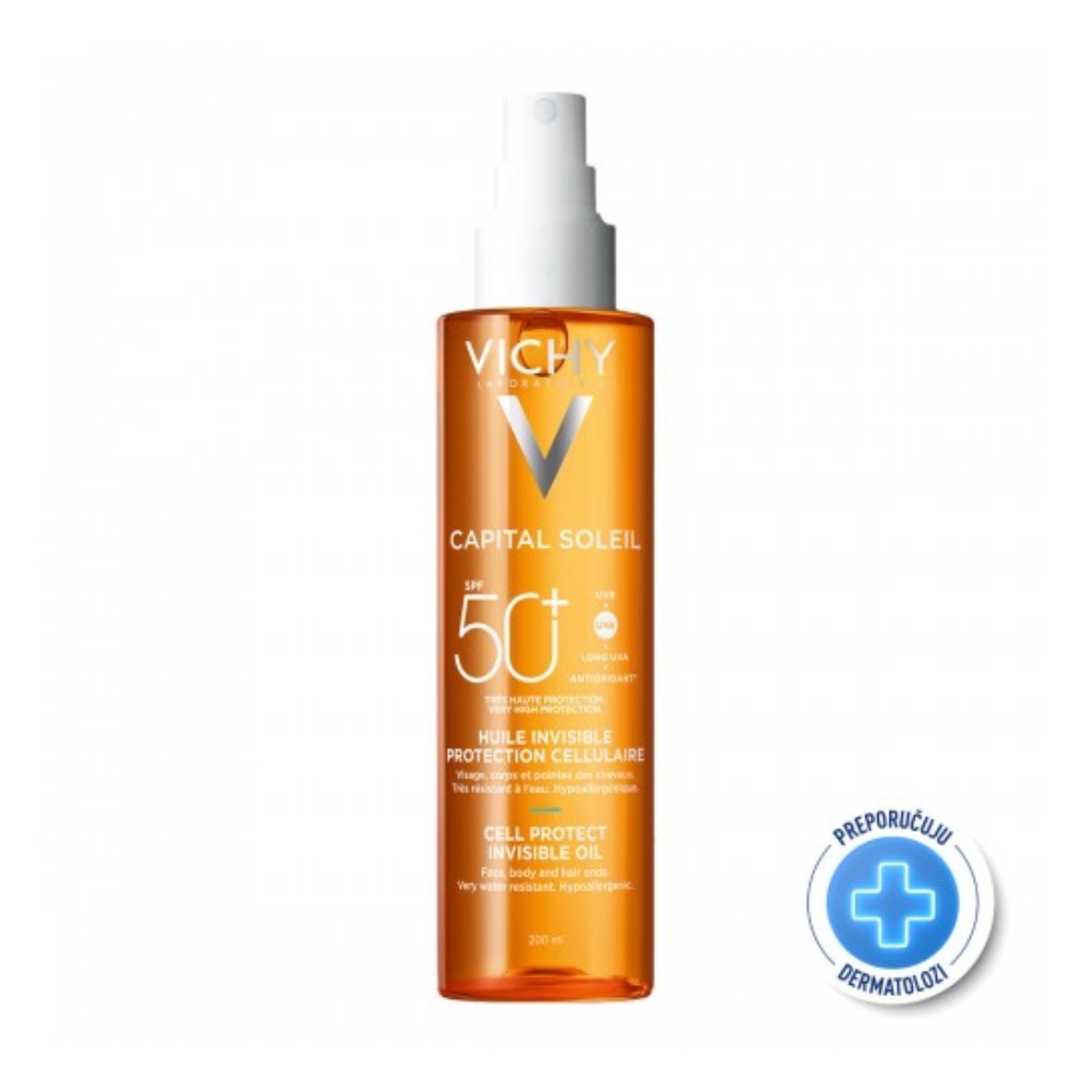 Vichy Capital Soleil Cell Protect zaštitno ulje SPF50+ 200 ml pruža visoku zaštitu od širokog spektra UVA i UVB zraka, dok istovremeno štiti kožu od oštećenja izazvanih slobodnim radikalima. Lagana i nemasna tekstura brzo se upija, ostavljajući kožu svilenkasto mekom i blistavom. Obogaćeno hijaluronskom kiselinom i Vichy vulkanskom vodom, pomaže u hidrataciji i jačanju kožne barijere, pružajući optimalnu zaštitu i njegu čak i pri intenzivnom izlaganju suncu.