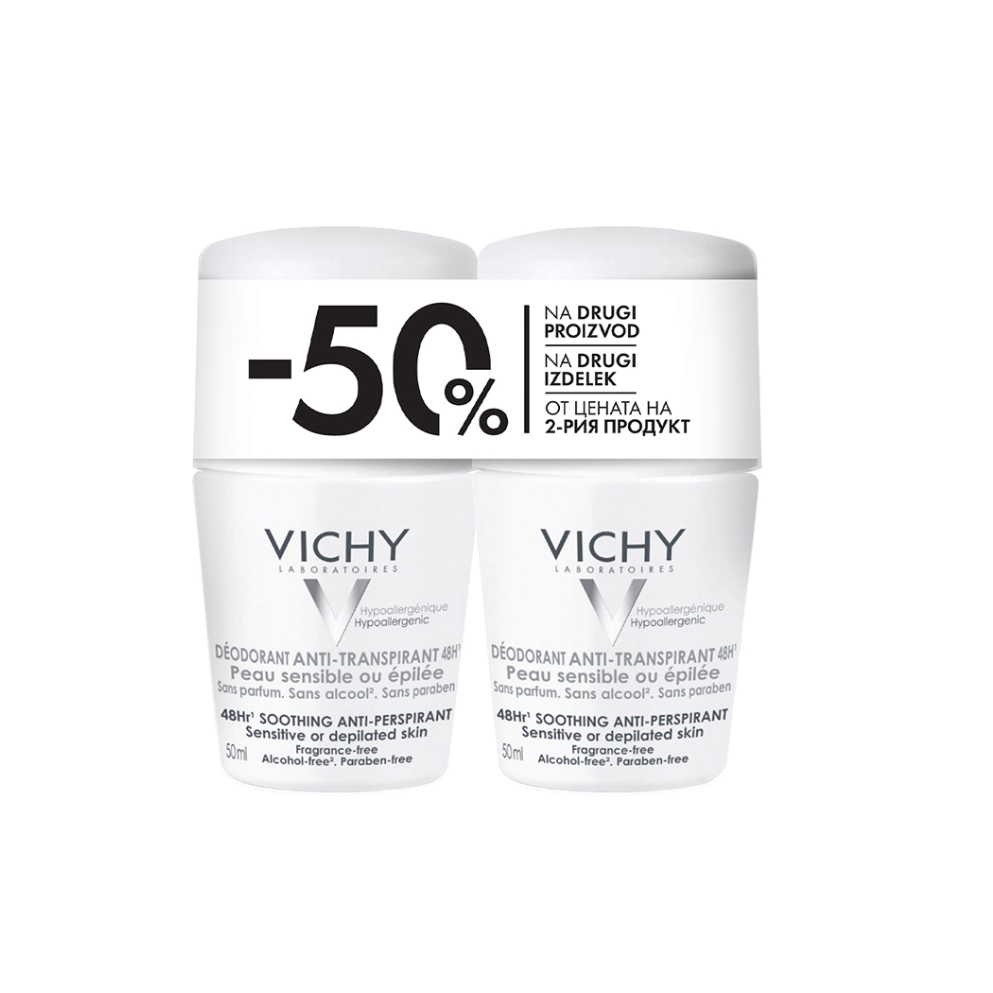 Vichy Deodorant Sensitive roll-on 50 ml pruža učinkovitu zaštitu od neugodnih mirisa do 48 sati, posebno formuliranu za osjetljivu i depiliranu kožu. Blaga formula bez alkohola i parabena umiruje, štiti i ne izaziva iritacije, dok lagana tekstura brzo upija i ne ostavlja tragove na odjeći. Obogaćen Vichy vulkanskom vodom, jača kožnu barijeru i pruža osjećaj svježine tokom cijelog dana. Pakovanje sadrži dva roll-ona od po 50 ml.